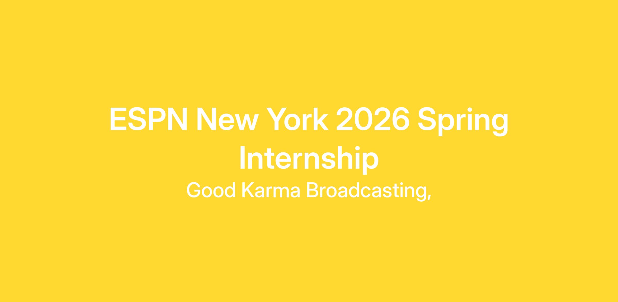 Good Karma Brands ESPN New York is currently recruiting college students for our 2026 spring internship program. This is a part-time paid in-person program based at our New York City office. The internship will provide an excellent opportunity for students to learn more about sports marketing and media. The ideal candidate will be an organized self-starter who is interested in hands-on experience in the areas of promotional event marketing, new business development, and sports content creation. The spring internship is a sports marketing and sales-based program that collaborates with ESPN New York, ESPN Radio Network & Podcasts, and Digital Operations. This internship is approximately 20 hours/week from March 9, 2026-May 1, 2026. Interns are paid $16.50 an hour and will gain experience in marketing, sales, and content.