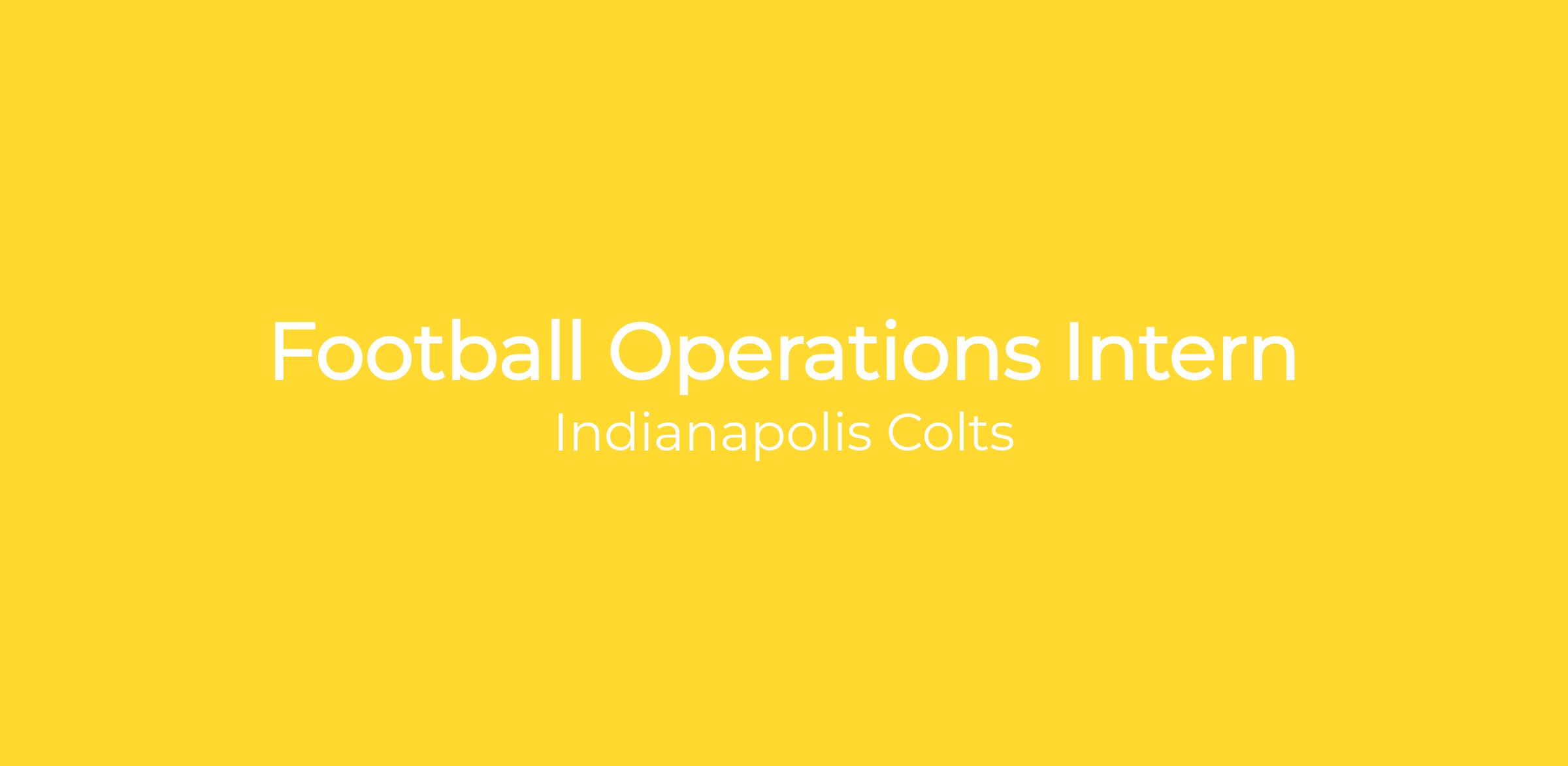 We are seeking a Football Operations Intern to contribute to the Indianapolis Colts Off-Season Programs and Training Camp. This role will support the Football Operations department through various football events such as NFL Draft, Off-Season Program, Rookie Mini Camp, Training Camp and Player Workouts. You will make integral contributions as a Colts team member and will gain real hands-on experience and exposure to an NFL organization.