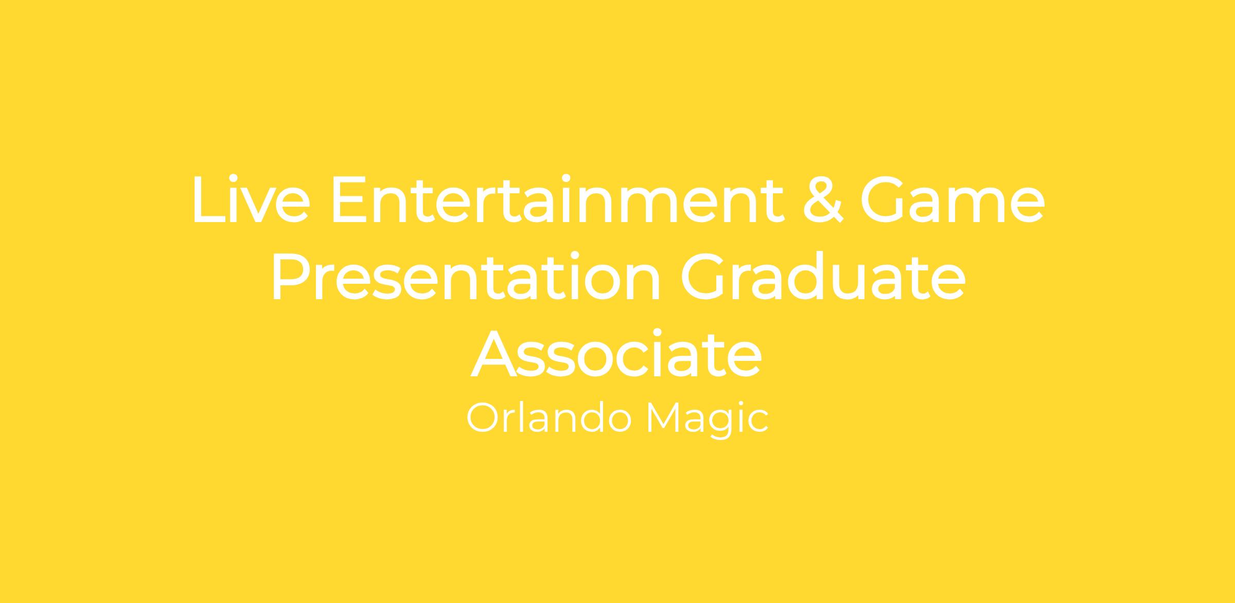 The Live Entertainment & Game Presentation Graduate Associate will assist in the development and execution of Live Event Production for Orlando Magic games and events, with a primary focus on in arena production, on court entertainment, and group performances. This role supports all elements of the game presentation experience inside the arena.